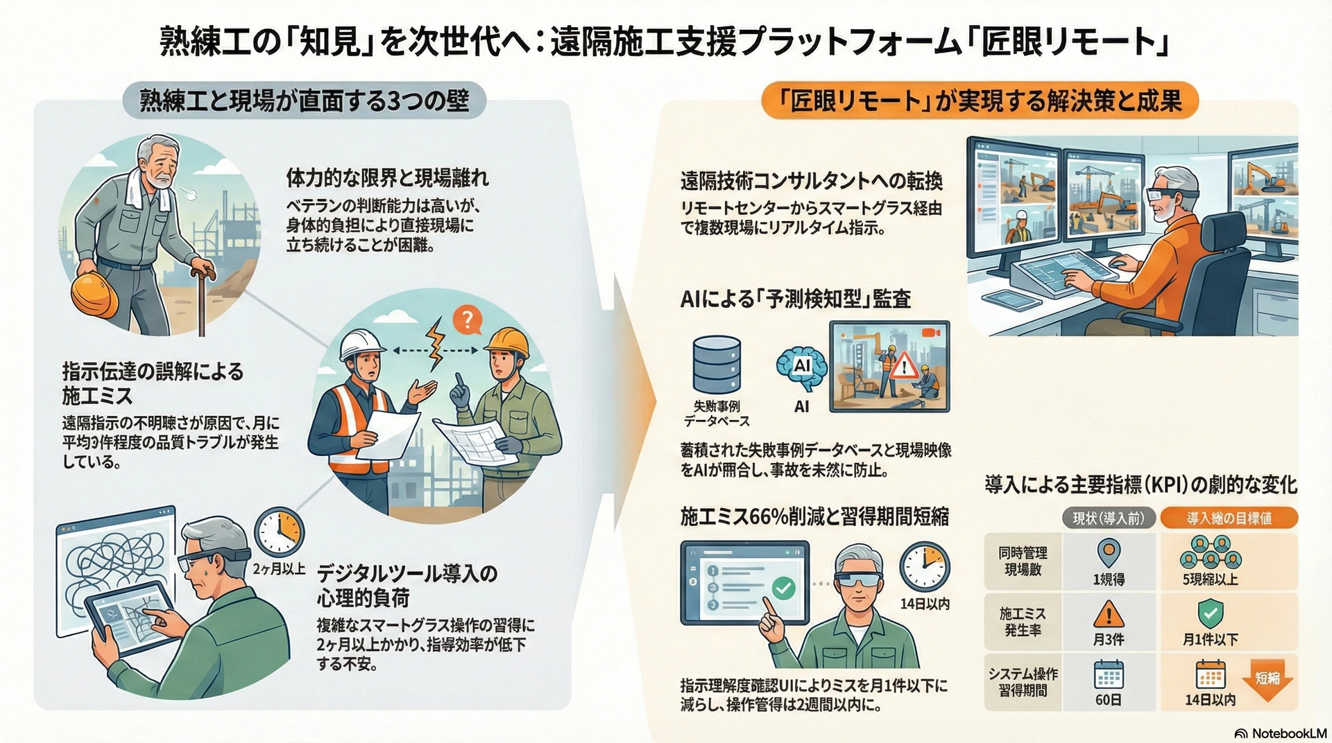 建設業界におけるベテラン技術者の退職は、技術力の喪失ではなく、主に体力の低下によって「現場に居られなくなること」が原因です。彼らの持つ高度な判断能力や「眼」は依然として健在であり、これを活用しないことは業界にとって大きな損失です。本事業「匠眼リモート」は、熟練工の役割を従来の「現場監督」から「遠隔技術コンサルタント」へとシフトさせるものです。自社内に「リモート・オペレーション・センター」を設立し、オフィスや自宅から複数の現場を同時に監督・支援する新しい働き方を創出します。
