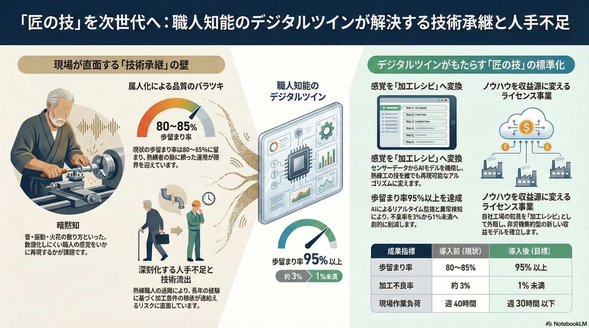 中堅・中小の金属加工業において、熟練職人の高齢化と退職に伴う技術喪失は経営を揺るがすリスクとなっています。
